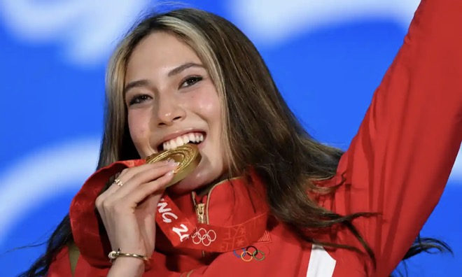 Eileen Gu ăn mừng chiếc huy chương vàng cho đoàn thể thao Trung Quốc.