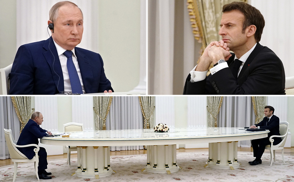 Hình ảnh TT Putin và người đồng cấp Pháp ngồi đối diện bên chiếc bàn có kích thước dị thường đã trở thành chủ đề bàn tán xôn xao trên mạng. Ông Putin có ngụ ý gì?