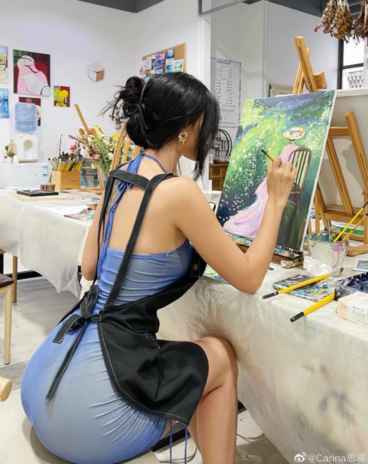 Carina thường xuyên đăng tải những hình ảnh diện trang phục gợi cảm khi vẽ tranh, chỉ nhìn từ phía sau cũng hút hàng ngàn lượt yêu thích trên mạng Weibo.