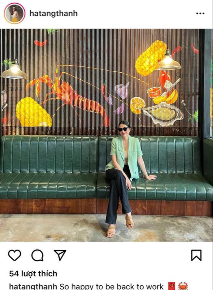 Mới đây, trên trang cá nhân Tăng Thanh Hà đăng tải hình ảnh với thần thái sang chảnh kèm chú thích: "So happy to be back to work" (Hạnh phúc khi được trở lại với công việc). Dòng trạng thái khẳng định ngoài việc chăm con cô vẫn không quên dành thời gian cho công việc.
