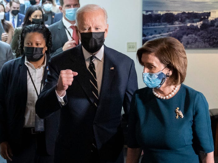 President Joe Biden and Speaker of the House Nancy Pelosi leave a meeting with House Democrats at the Capitol on October 28, 2021. Drew Angerer/Getty Images