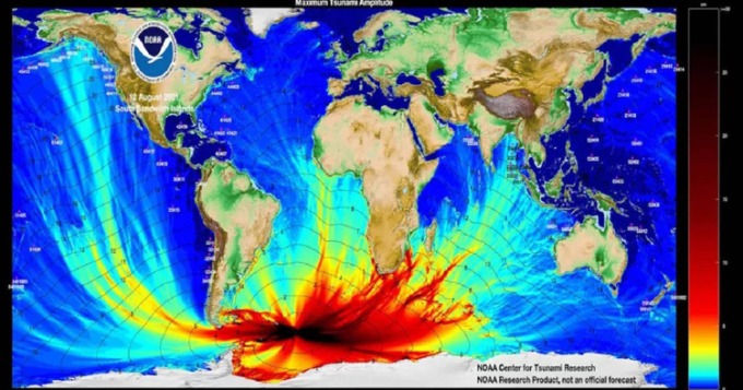 Từ nguồn ban đầu ở Nam Đại Tây Dương, trận sóng thần năm 2021 gây ra những gợn sóng lan rộng khắp thế giới. Ảnh: Trung tâm Nghiên cứu Sóng thần NOAA