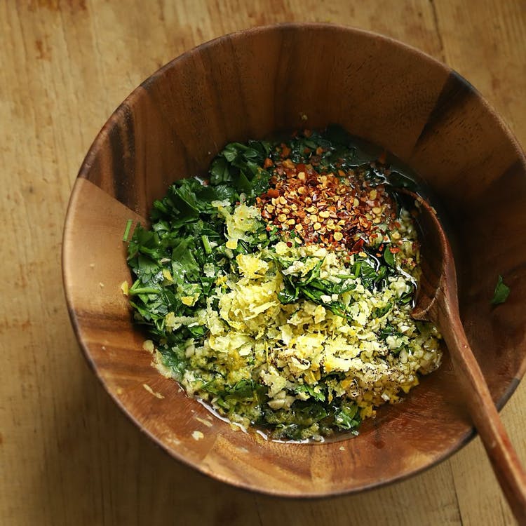 Cho rau mùi tây vào bát, thêm tỏi băm nhỏ, muối, ớt bột, giấm rượu vang, mạch nha, nước cốt chanh, dầu oliu, vỏ chanh bào, bột tiêu vào trộn đều.