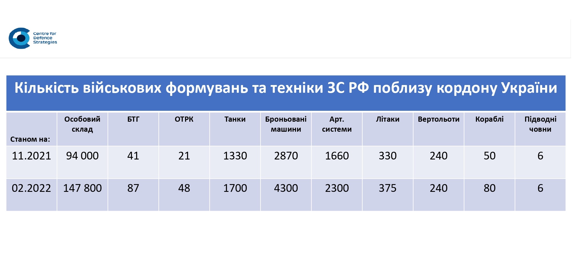 Cụ thể, tài liệu của CDS chỉ ra rằng tính đến ngày 10/2, phía Nga đã tập hợp được 87 tiểu đoàn chiến thuật, tức là khoảng 147,8 nghìn quân nhân - cùng lực lượng không và hải quân sẵn sàng hỗ trợ - đang đóng tại các khu vực của Nga, Belarus, Crimea và Donbass.
