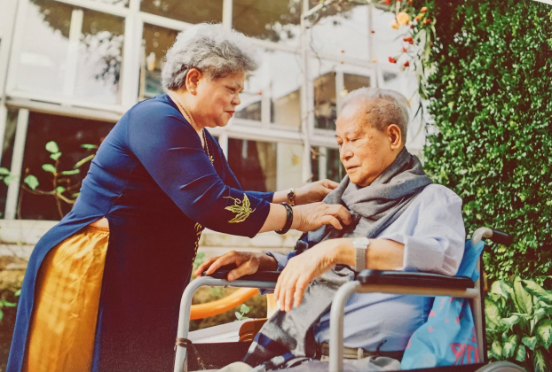 Ông ở khu B, còn bà ở khu A. Sáng chiều nắng ấm bà hay sang dìu ông ra ghế đá ngồi, hoặc đẩy xe đưa ông đi dạo dưới tán cây xoài, cây nhãn cổ thụ trong khuôn viên. Bà còn hay nhờ các điều dưỡng mua thêm đồ ăn vặt để chuẩn bị bữa phụ cho ông. Một số ngày khỏe, họ bắt taxi lên phố, đổi bữa bằng những món miến ngan, bánh tôm Hồ Tây...