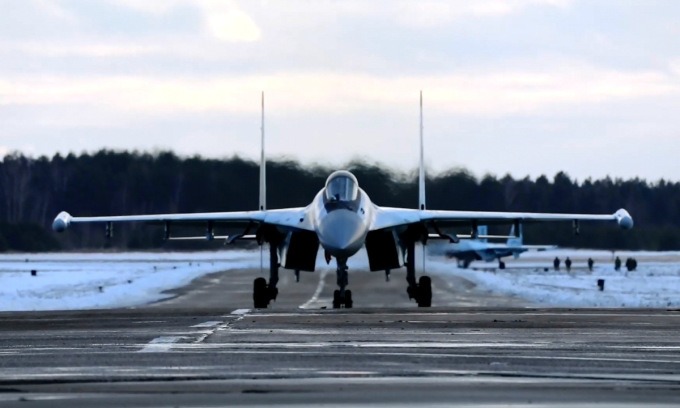 Tiêm kích Su-35S Nga đến tập trận Quyết tâm Đồng minh 2022 tại Belarus cuối tháng 1. Ảnh: BQP Nga.
