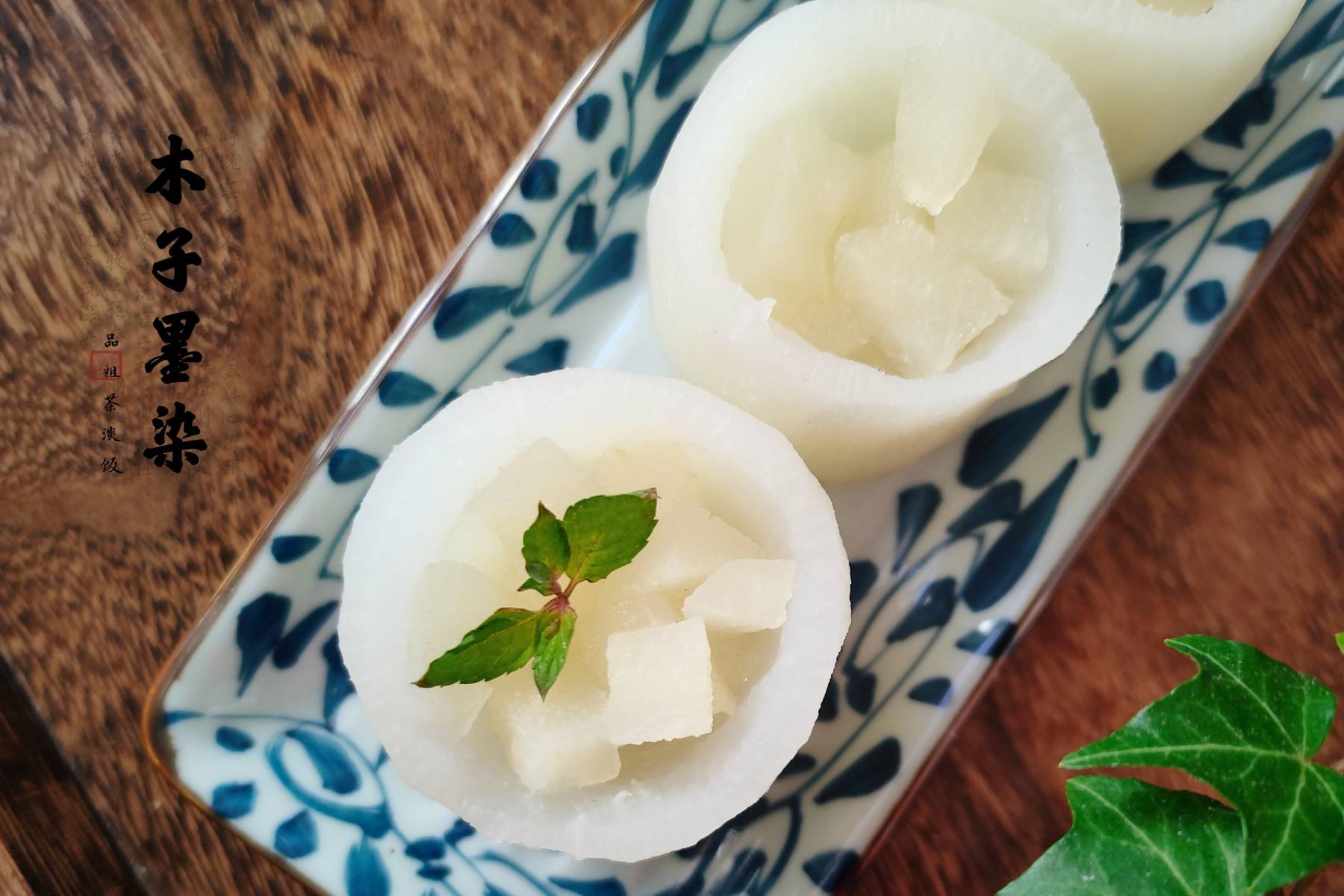 Củ cải gọt vỏ, rửa sạch, cắt thành 3 khúc, nạo ở giữa để tạo thành một cái cốc. Tiếp theo, lê cắt khối vuông, cho vào “cốc” củ cải, thêm một ít đường phèn, đặt vào xửng hấp trong 25 phút là xong.