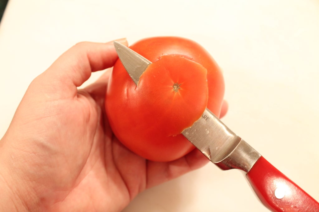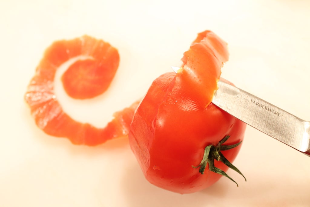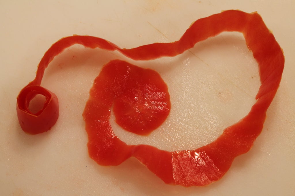 Tiếp theo có lẽ là phần khó nhất. Cắt từ từ miếng vỏ vòng quanh quả cà chua, tạo thành một dải dài, rộng khoảng 0,5cm, giống như cách gọt vỏ táo.
