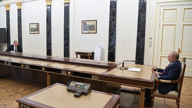 Tổng thống Nga Vladimir Putin ngày 14/2 đã họp với Ngoại trưởng Sergei Lavrov và Bộ trưởng Quốc phòng Sergei Shoigu. Chủ nhân Điện Kremlin được nhìn thấy ngồi cách xa hai quan chức này vài mét bởi một chiếc bàn kích thước lớn.