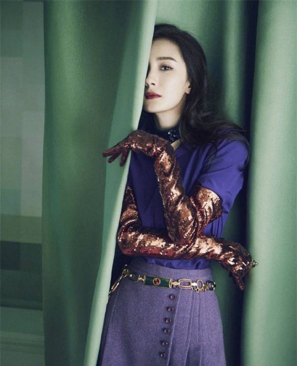 Trong ảnh, Dương Mịch diện tóc xoăn gợn sóng to bồng bềnh đầy quyến rũ. Nữ diễn viên diện chiếc váy màu tía kết hợp với thắt lưng kim loại tạo nên độ tương phản mạnh mẽ, gây ấn tượng với người đối diện.