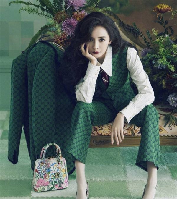 Trong một bức ảnh khác, Dương Mịch mặc một bộ vest xanh lá cây, ngồi trên ghế sofa, toát lên vẻ quyến rũ. Cô nàng đã mix áo ghi lê cùng áo sơ mi trắng, kết hợp với cà vạt để làm tăng thêm phong cách của bản thân.Hình dáng tổng thể của nữ diễn viên trông vừa quyến rũ lại vừa hoài cổ.