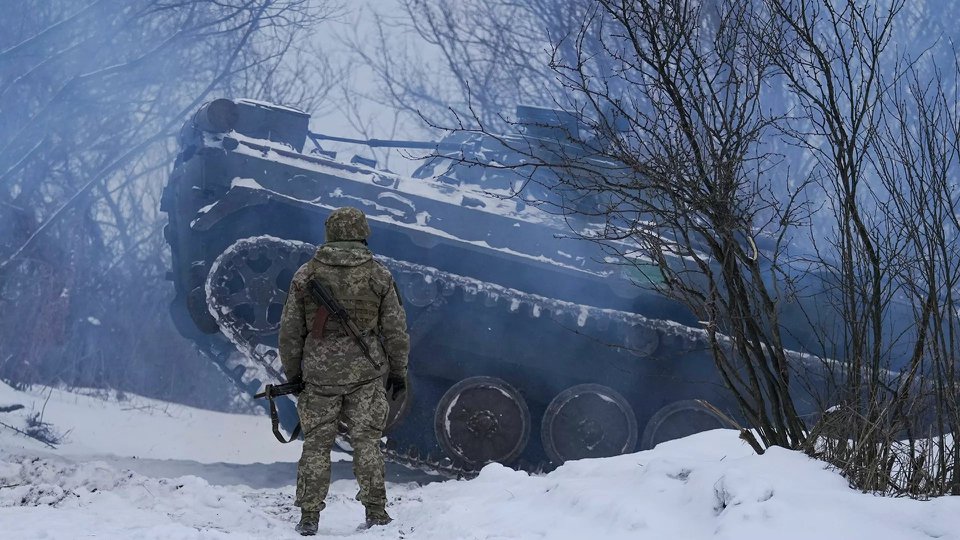 Xe tăng và binh lính Ukraine tại vùng Luhansk thuộc Donbas, miền Đông Ukraine. Ảnh: AP.