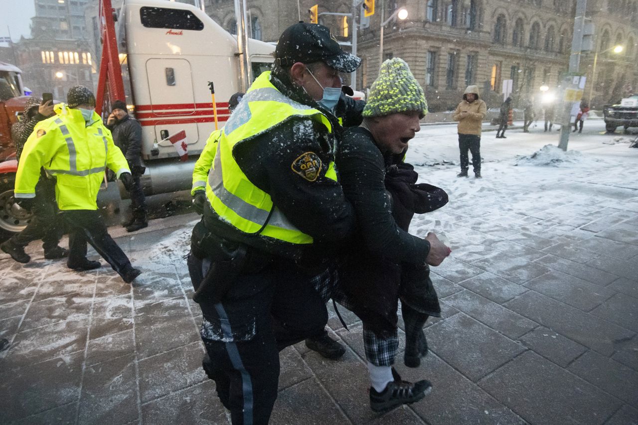 Cảnh sát Ottawa bắt giữ người biểu tình để lập lại ổn định tại khu vực trung tâm thủ đô. Ảnh: Getty Images