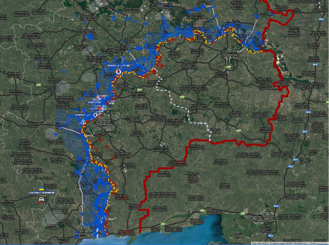 Bản đồ chưa xác thực cho thấy các lực lượng đóng hai phía giới tuyến Donbass. Mariupol và đoạn bờ biển Azov do DPR kiểm soát nằm phía dưới bản đồ.