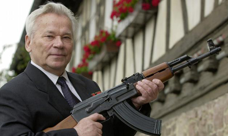 Kỹ sư Mikhail Kalashnikov trong bức ảnh chụp năm 2002 bên khẩu AK-47 do anh sáng chế. Ảnh: DW