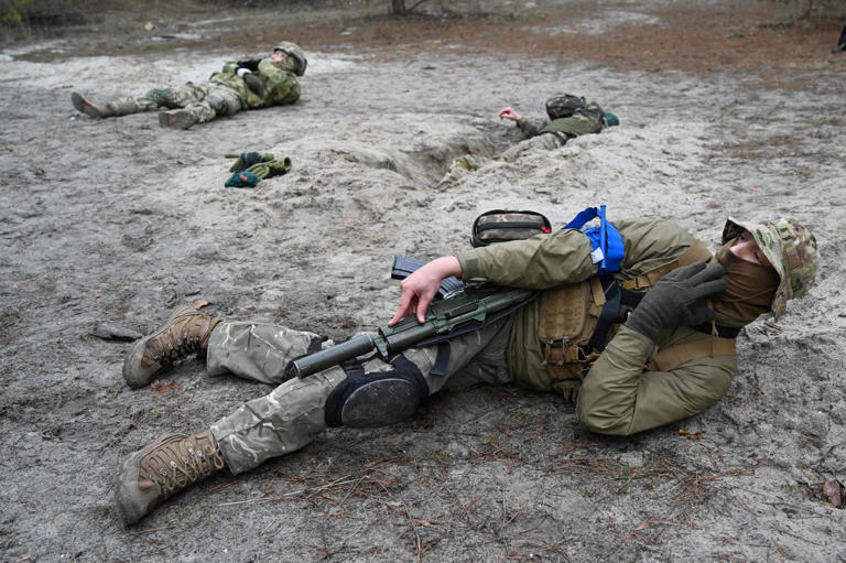 The Ukrainian Territorial Defence Forces, the military reserve of the Ukrainian Armed Forces, take part in a military drill outside Kyiv on February 19, 2022.