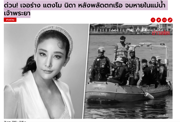 Hàng loạt các trang báo đưa tin, sau 38 giờ tìm kiếm, cuối cùng lực lượng chức năng đã tìm thấy thi thể của nữ diễn viên Chiếc Lá Bay Tangmo Nida (Tangmo Pattaratida) trôi trên sông Chao Phraya. Cô qua đời ở độ tuổi 38.