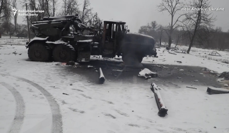 Ảnh do chính quyền Ukraine công bố cho thấy, một đoàn xe của Nga bị phá hủy bao gồm các bệ phóng MLRS gần Kharkiv. Ảnh INews.