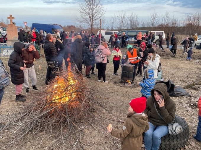 Tại cửa khẩu Medyka, nơi đông đúc nhất của Ba Lan dọc theo biên giới với Ukraine dài khoảng 500 km, mọi người ngồi co cụm bên những đống lửa dưới nhiệt độ lạnh cóng khi chờ xe buýt đưa họ đến các trung tâm tiếp nhận. Chai lọ, quần áo và các vật dụng vứt bừa bãi trên đường. Vài trăm người khác tụ tập gần một cửa hàng tạp hóa địa phương.