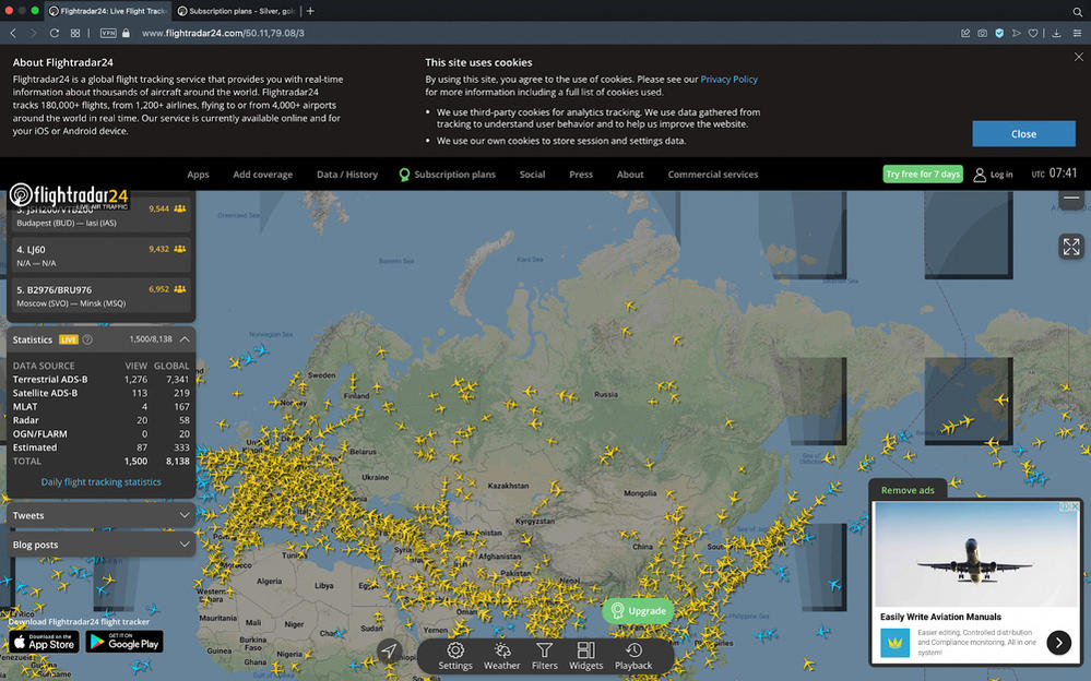 Ông Mikael Robertsson, người đồng sáng lập trang web Flightradar24 trả lời phỏng vấn kênh CNN: "Do quy mô địa lý của Nga, hằng ngày có rất nhiều chuyến bay đi qua không phận của nước này. [...] Hằng ngày, có hàng chục chuyến bay xuất phát từ Vương quốc Anh đi qua Nga để đến các nơi như Hồng Kông và Ấn Độ. [...] Với các nước thuộc khối Liên minh Châu Âu, có hàng trăm chuyến bay quá cảnh tại Nga trên đường di chuyển đến các điểm đến ở Châu Á".