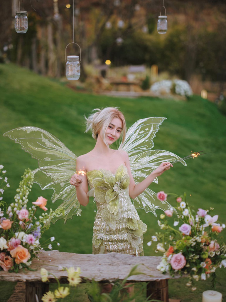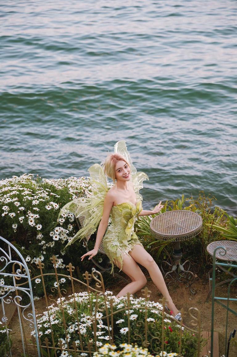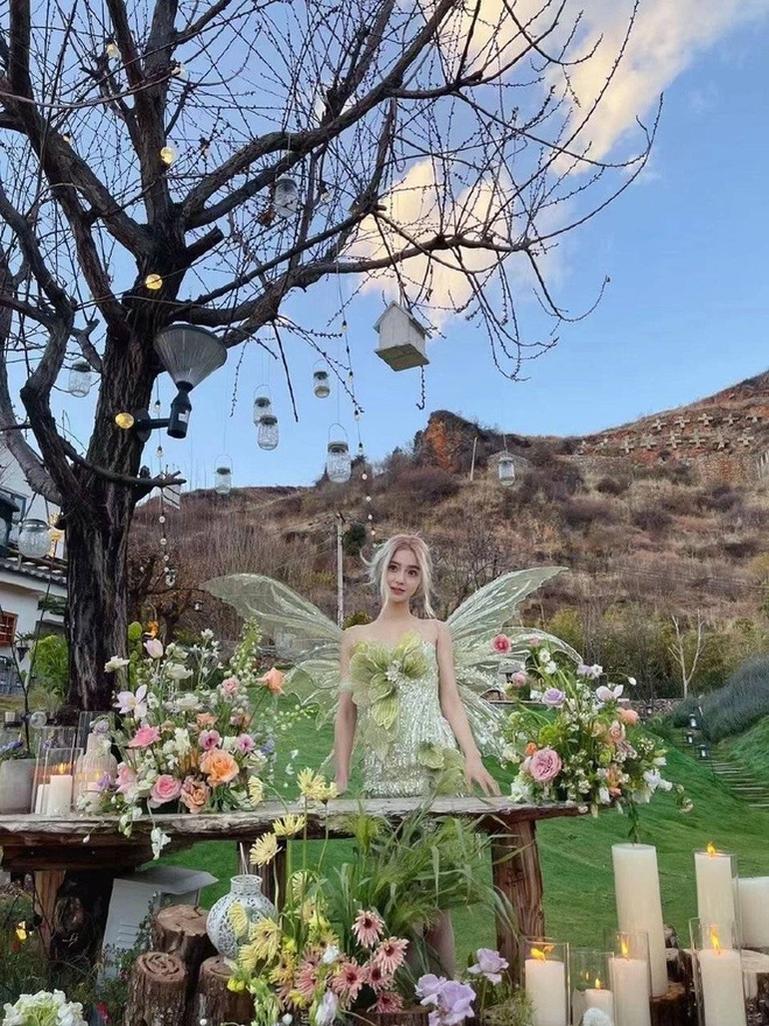 Cô biến mình thành nhân vật hoạt hình Tinker Bell, xung quanh đều là khung cảnh thần tiên được bài trí cực kỳ công phu gồm nến, hoa và những dãy nhà gỗ. Người đẹp còn gây ấn tượng với mái tóc vàng khác lạ, hiện đại.