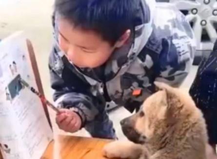 Cậu bé dạy chó con từng chữ một, chú chó cũng kiên nhẫn làm theo để "nhận biết ký tự". Một bé và một chó hợp tác ăn ý, chẳng khác gì thầy giáo dạy học trò.
