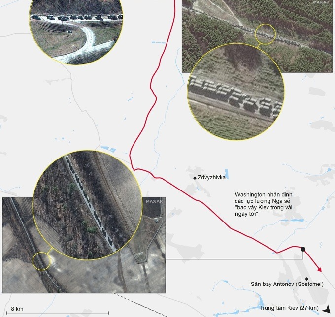 Ảnh vệ tinh chụp đoàn xe quân sự Nga áp sát Kiev hôm 28/2. Ảnh: Maxar.