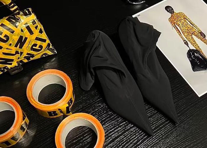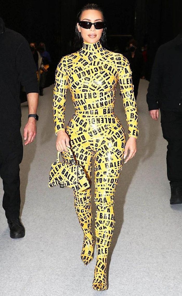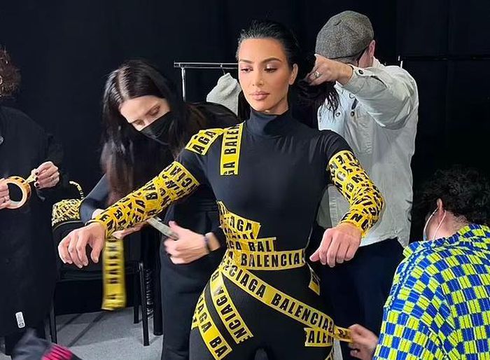 Kim diện bộ đồ đen bó sát cơ thể và để cho một ê kíp đông đảo quấn băng dính vàng in tên hãng Balenciaga từ cổ đến chân và cả chiếc túi cô mang theo.