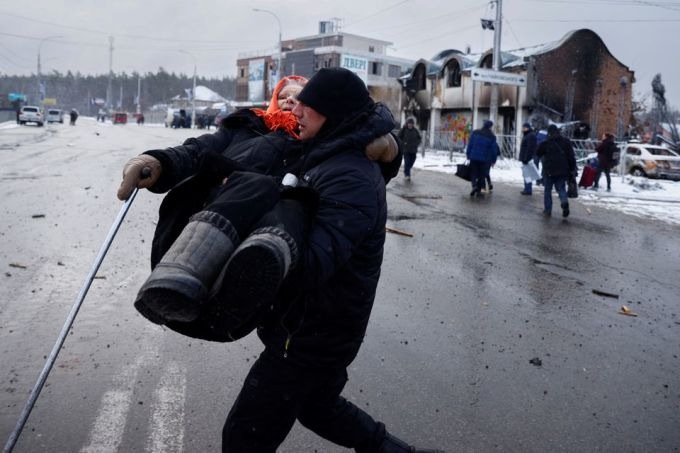 Người đàn ông bế một cụ bà để di tản khỏi Irpin ngày 8/3. Ảnh: Reuters.