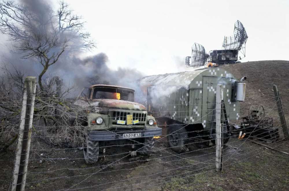 Radar và thiết bị quân sự bị phá hủy tại căn cứ Ukraine ở ngoại ô thành phố Mariupol ngày 24/2/2022. Ảnh: AP