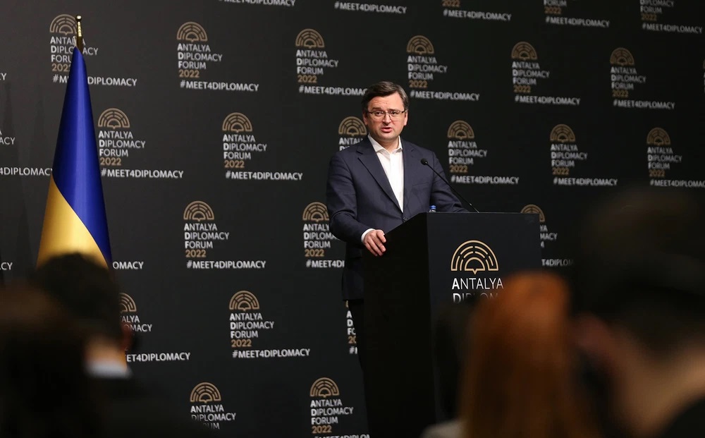 Bộ trưởng Ngoại giao Ukraine Dmytro Kuleba tổ chức họp báo sau cuộc họp Bộ trưởng Ngoại giao ba bên Nga-Thổ Nhĩ Kỳ-Ukraine tại Diễn đàn Ngoại giao Antalya ở Antalya, Thổ Nhĩ Kỳ, vào ngày 10 tháng 3. Ảnh: Orhan Cicek / Anadolu Agency / Getty Images