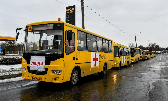 Đoàn ôtô đầu tiên rời thành phố cảng miền nam Mariupol sau 10 ngày Nga, Ukraine cáo buộc nhau vi phạm ngừng bắn, cản trở hành lang nhân đạo.