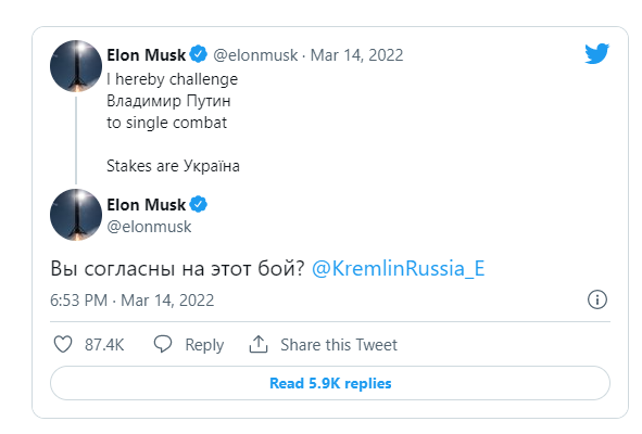 "Ông có chấp nhận cuộc chiến này không?" - ông Elon Musk viết thêm bằng tiếng Nga, tag cả tài khoản Twitter chính thức bằng tiếng Anh của Điện Kremlin.