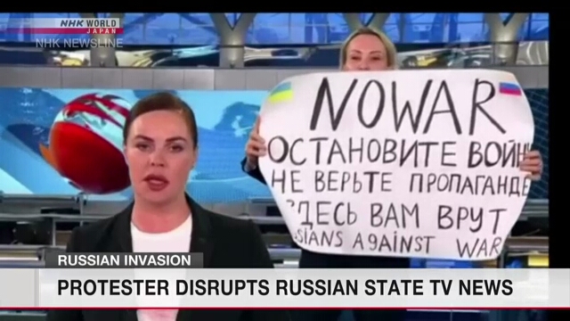 Một người phụ nữ cầm bảng phản đối cuộc chiến của Nga tại Ukraine cầm bảng đưa qua đưa lại sau lưng một anchor truyền hình trong lúc cô này đang đọc tin và trực tiếp truyền hình ngay trong chương trình tin tức buổi tối trên Kênh 1 do nhà nước kiểm soát vào tối thứ Hai 14/3.
