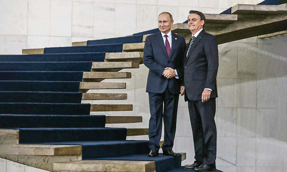 Tổng thống Nga Vladimir Putin và Tổng thống Brazil Jair Bolsonaro tham dự Hội nghị thượng đỉnh Nhóm các nền kinh tế mới nổi hàng đầu thế giới (BRICS) vào tháng 11/2019 tại thủ đô Brasilia của Brazil. Ảnh: AFP