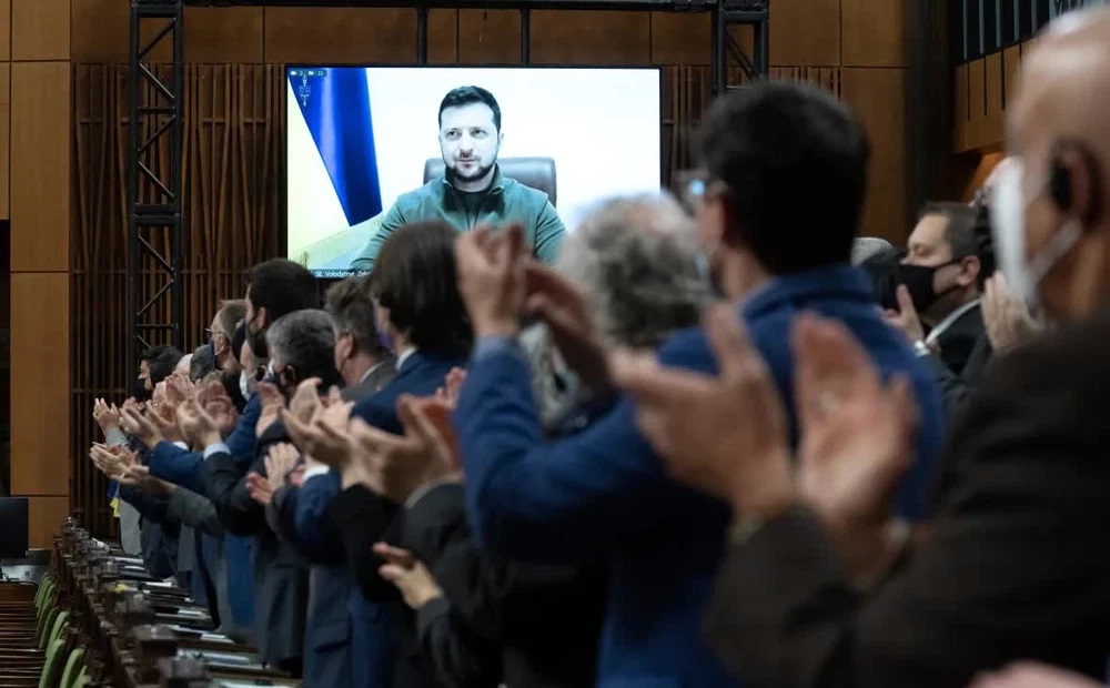 Tổng thống Ukraine Volodymyr Zelensky đã có bài phát biểu trước Quốc hội Canada qua video khi ông kêu gọi Canada "áp đặt nhiều biện pháp hơn" để giúp Ukraine phòng thủ trước hành động quân sự của Nga, khiến các nghị sĩ Canada vỗ tay rần rần khi hình ảnh TT Ukraine được chiếu trên màn hình video lớn vào ngày 15/3.