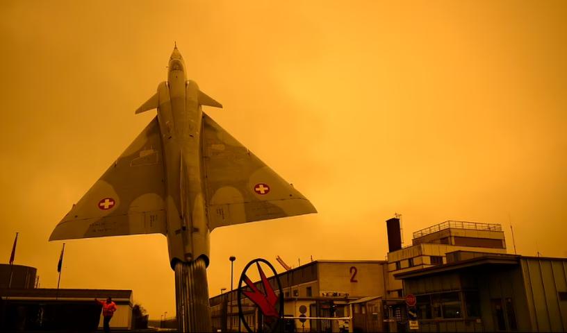 Máy bay chiến đấu của Không quân Thụy Sĩ Mirage 2000 trưng bày trước lối vào tại Căn cứ Không quân Payerne giữa bầu không khí ánh sáng đặc biệt ở Thụy Sĩ.