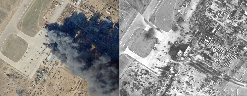 Ảnh vệ tinh hôm 15/3 (trái) và 16/3 (phải) cho thấy thiệt hại của lực lượng Nga ở Căn cứ Không quân được đánh giá là khá lớn.