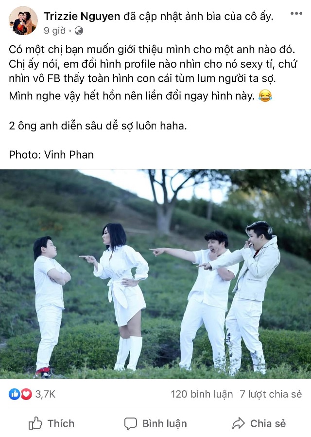 Mới đây, trên trang Facebook cá nhân, Trizzie Phương Trinh đăng tải hình ảnh chụp chung với 3 con trai kèm caption: "Có một chị bạn muốn giới thiệu mình cho một anh nào đó. Chị ấy nói, em đổi hình profile nào nhìn cho nó se*y tí, chứ nhìn vô Facebook thấy toàn hình con cái tùm lum người ta sợ. Mình nghe vậy hết hồn nên liền đổi ngay hình này. 2 ông anh diễn sâu dễ sợ luôn haha".