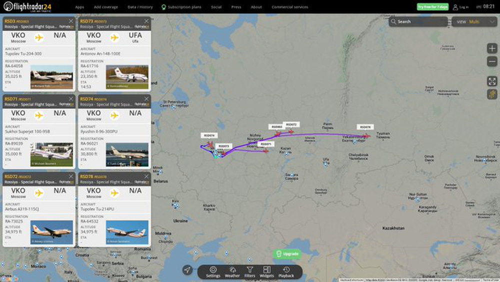 Cụ thể, chỉ trong vài giờ đồng hồ ngày 17/4, đã có hơn một chục chuyến bay của Không quân Nga và Phi đội bay Đặc biệt “Rossiya” xuất phát từ Moscow cũng như các sân bay lân cận và di chuyển về nhiều hướng khác nhau, nhưng chủ yếu tiến về phía Đông.