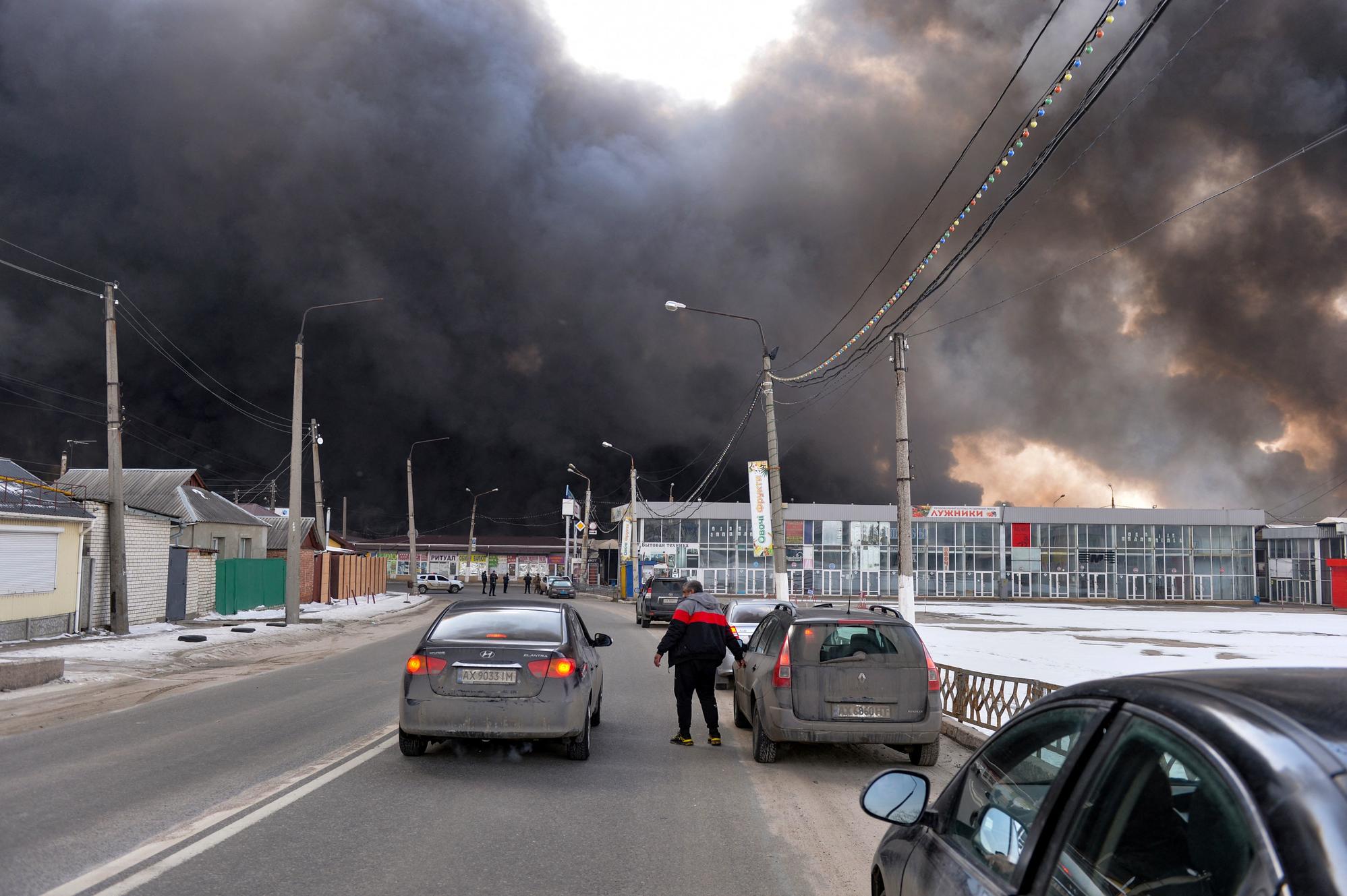 Khói đen bốc lên từ chợ Barabashovo ở thành phố Kharkiv thứ Năm, ngày 17 tháng 3, 2022, sau khi chợ bị trúng những trái hỏa tiễn của Nga. Đây là ngôi chợ lớn nhất Ukraine, rộng 75 mẫu hecta và có nhiều cửa hàng của người Việt Nam. (Sergey Bobok/ AFP via Getty Images)
