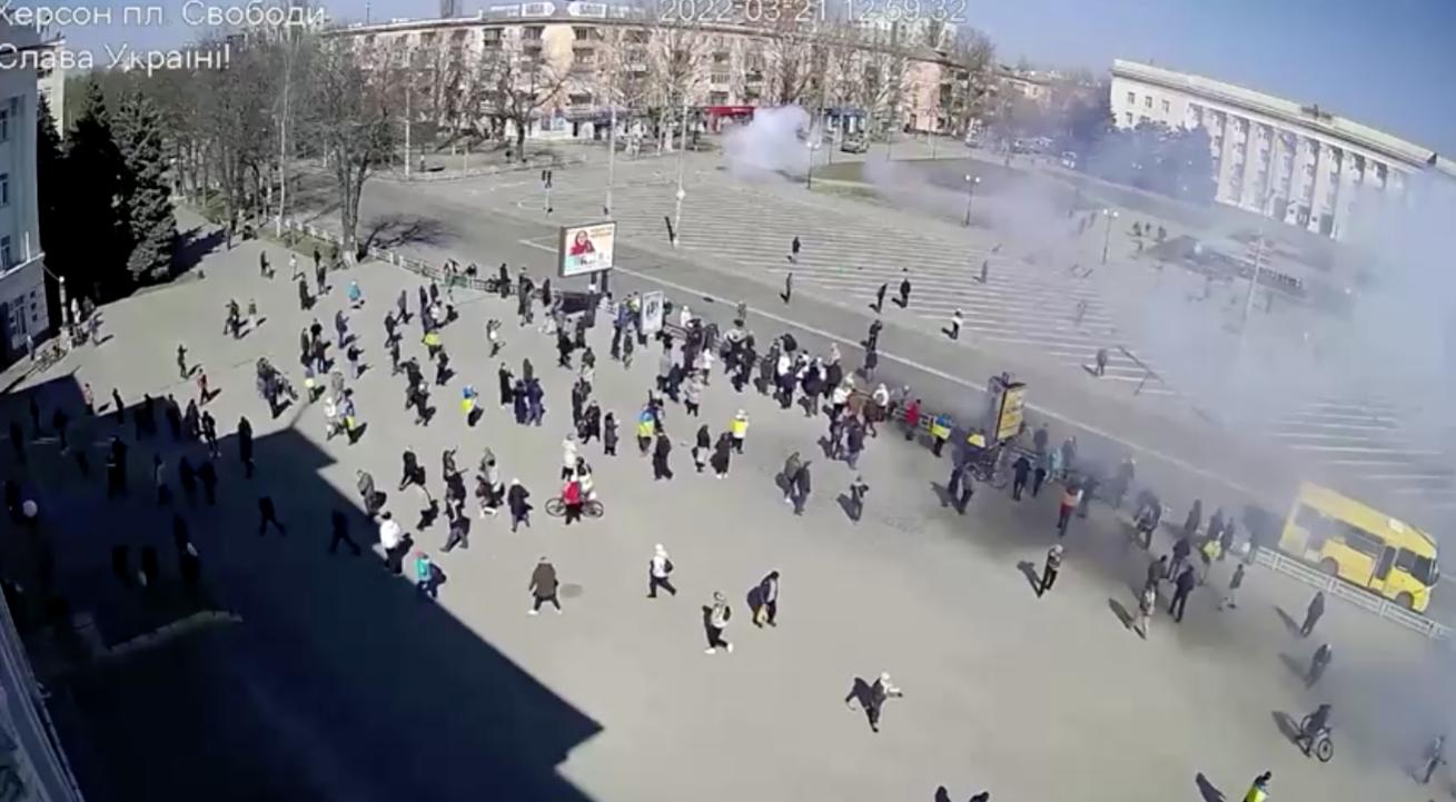 Hãng tin Reuters cho hay Moscow đang phủ nhận việc nhắm vào dân thường. Cảnh quay video cho thấy hàng trăm người biểu tình ở Freedom Square của Kherson đang bỏ chạy khi lựu đạn rơi xung quanh họ. Những tiếng nổ lớn, tiếng súng và những đám khói màu trắng có thể được nhận thấy rõ ràng trong video.