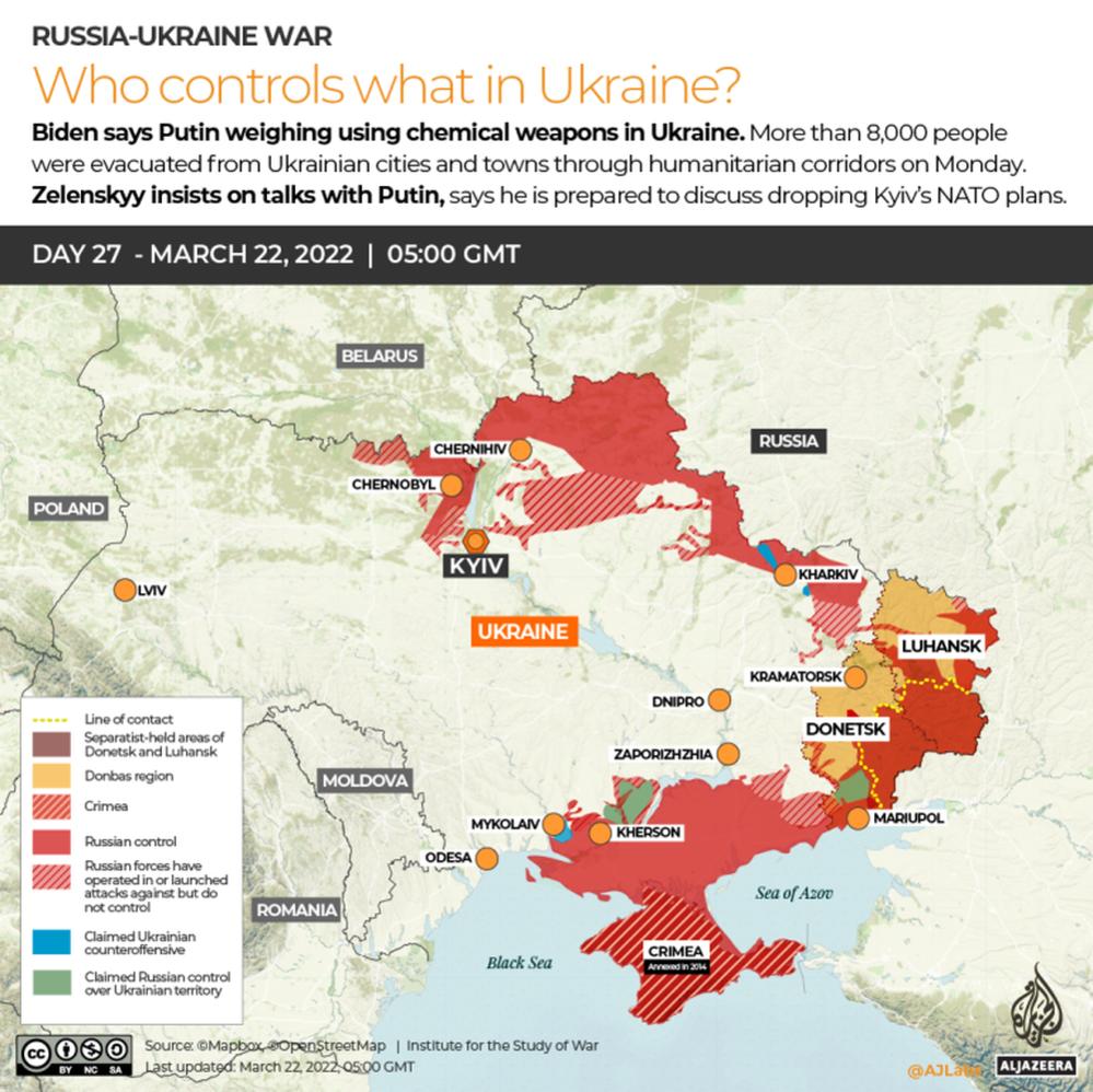 Bản đồ chiến sự Ukraine tính tới ngày 22/3. Nguồn: Al Jazeera