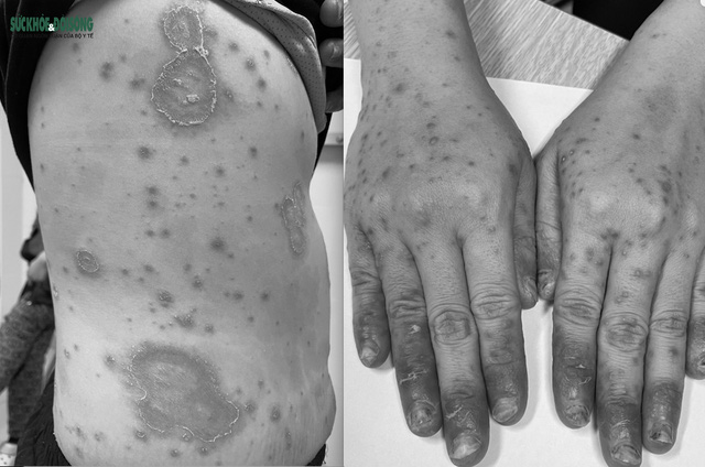 Lúc này, trên khắp hai bàn tay của chị chi chít ban đỏ hồng, nhiều nốt mưng mủ trắng, bong vảy khô. 10 đầu ngón tay chuyển màu bầm đỏ rượu vang, móng tay ngả vàng, dày sừng, xù xì. Chưa kể khắp thân mình, đặc biệt vùng thân trên, ban đỏ nổi mảng, đóng vảy trắng. Bác sĩ nói trường hợp của chị điều trị khá khó.