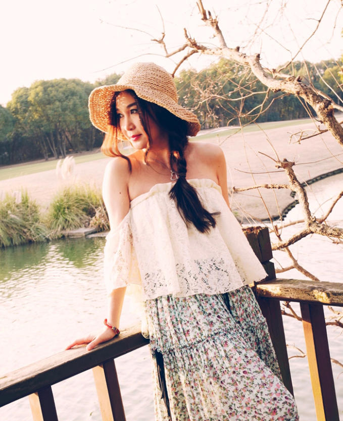 Hôm 22/3, diễn viên đăng trên trang cá nhân ảnh đi ngắm cảnh hồ, ngắm hoa xuân. Cô chọn áo quây ngực phối váy họa tiết hoa nhí.
