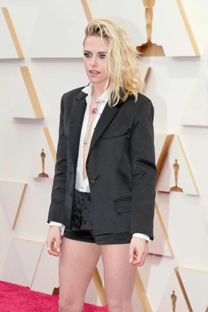 Ngôi sao được đề cử giải Nữ diễn viên chính xuất sắc nhất với vai Công nương Diana trong phim Spencer diện áo khoác tuxedo cắt xéo, quần đồng điệu và áo blouse trắng hở cúc. Bộ trang phục này đến từ nhà mốt Chanel.WSJ nhận định: “Đây có thể là chiếc quần shorts nóng bỏng nhất từng xuất hiện trên thảm đỏ Oscar”.
