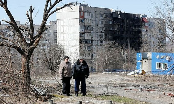 Local residents gather in a courtyard near a building damaged in the course of Ukraine-Russia conflict in the besieged southern port city of Mariupol, Ukraine March 28, 2022. Photo by Reuters/Alexander Ermochenko