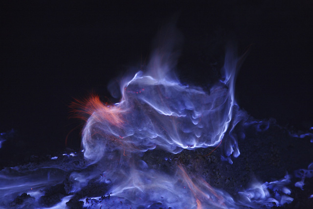 Sức nóng của magma đôi khi đốt cháy bụi lưu huỳnh trong đất, tạo thành những ngọn lửa màu xanh lam bao phủ lên dung nham màu đỏ vào ban đêm.