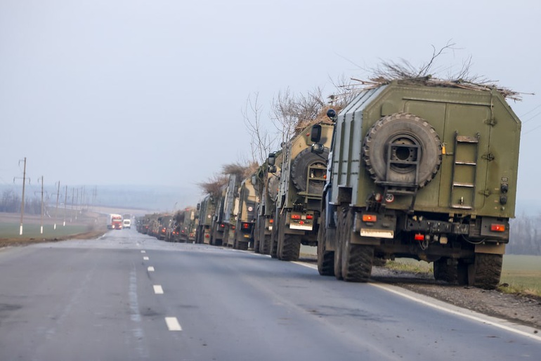 Các phương tiện quân sự tại Rostov, Nga đang di chuyển về phía biên giới tại vùng Donbas, Đông Ukraine hôm 23/3 (Ảnh: Getty).