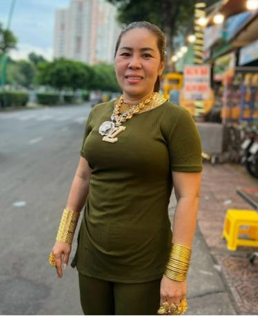 16 giờ, chị Thúy, 41 tuổi được nhân viên chở từ nhà ra quán bò nướng của mình trên đường Hoàng Sa, quận 3. Tay phải đã đeo sẵn bộ lắc vàng dạng mắt xích, tay trái là 18 chiếc vòng trơn, phủ kín đến gần khủyu tay, trên các ngón cũng được che khuất bởi nhiều chiếc nhẫn có mặt hình bông hoa lớn.